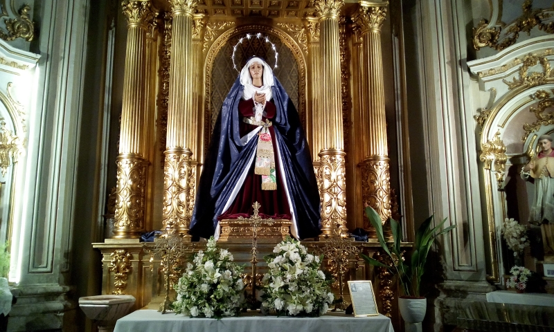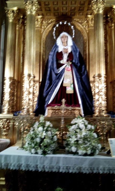 Desde hace ya unos años nuestra Madre se muestra ante los Hermanos, fieles y devotos con la vestimenta de hebrea, representativa de este momento litúrgico para invitarnos a vivir junto a Ella los cuarenta días previos a la llegada de la Semana Santa. Así, durante la Cuaresma, la Virgen de la Soledad del Puente se muestra desprovista de bordados y vestida con una saya de color rojo oscuro y un manto azul de damasco, junto a un tocado sencillo dispuesto sobre el rostro de la Virgen en forma de tablas. La corona que habitualmente luce en su altar es sustituida por una aureola, donada por la familia Ruiz Galache y que completa la vestimenta del manto y la saya que ya donase también años atrás.
