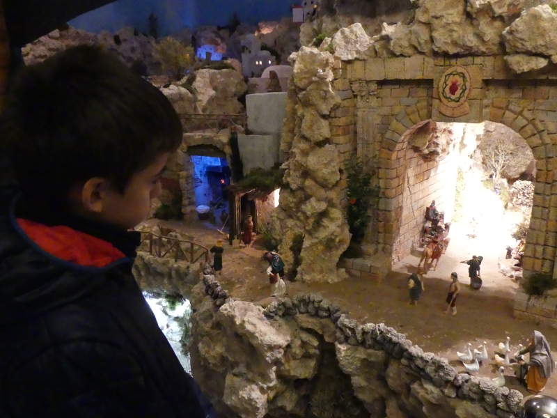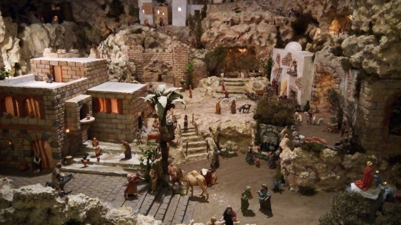 Las figuras que componen la obra, en su amplia mayoría donadas a la Hermandad por el hermano Félix Soriano de la Hoz, están hechas a mano con gran maestría y se mezclan con otras propiedad de la Hermandad para otorgar la proporcionalidad justa al conjunto. Así, podemos ver figuras más alejadas que miden unos 4 o 5 cm hasta otras más cercanas y en primer plano de la escena que miden unos 15 o 20 cm. Por otro lado, dos alturas ofrecen la posibilidad de disfrutar de bellos paisajes y parajes, callejuelas, grutas y cuevas, zonas montañosas con nutridos rebaños de ovejas, barriadas del poblado, y un sinfín de detalles estáticos y en movimiento para que el visitante pueda disfrutar al máximo de lo que fue la vida en aquel importante momento de la llegada del Mesías.