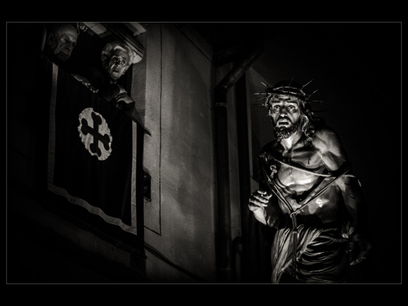 El Segundo Premio, Premio “Eurográficas”, dotado con 200 euros y Trofeo, ha recaído sobre la fotografía que lleva por título “ECCE HOMMO, HE AQUÍ EL HOMBRE”, y cuyo autor es DAVID SAIZ OLIVARES. donde dos personas de avanzada edad contemplan desde su balcón esta impresionante talla del Ecce Hommo de San Miguel.