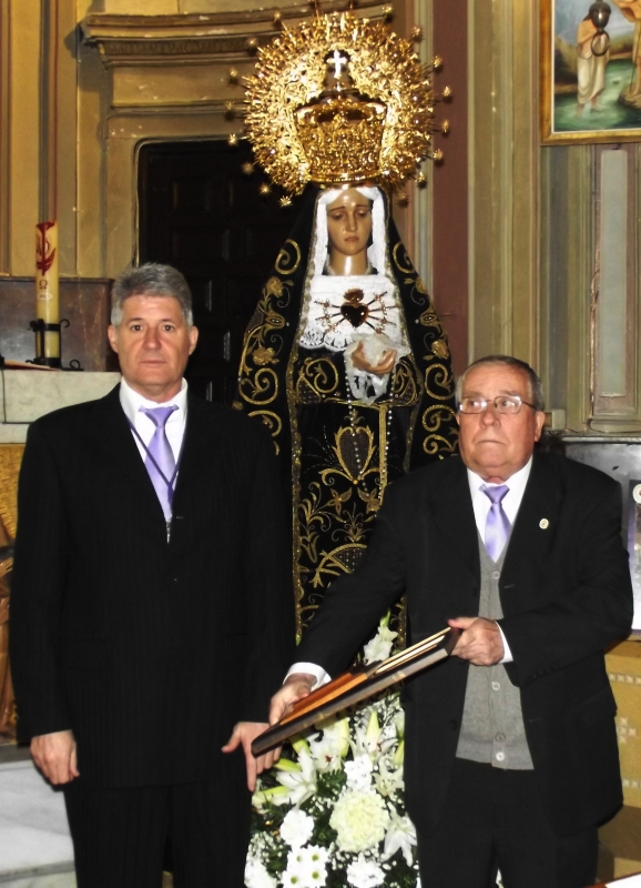 Martínez se dirigía a todos los asistentes con unas bonitas palabras de reconocimiento hacia estos hermanos. "Son la prueba feaciente de la dedicación, devoción y amor a un sentimiento, el amor de unos hijos hacia su Madre, y por ello son el camino que debe marcar a las generaciones futuras. Durante toda su vida estos Hermanos se han mantenido dispuestos a prestar su colaboración y ayuda al igual que María no dejó solo a su Hijo en aquellos tiempos y por ello, la Hermandad así se lo reconoce en el día de hoy".
