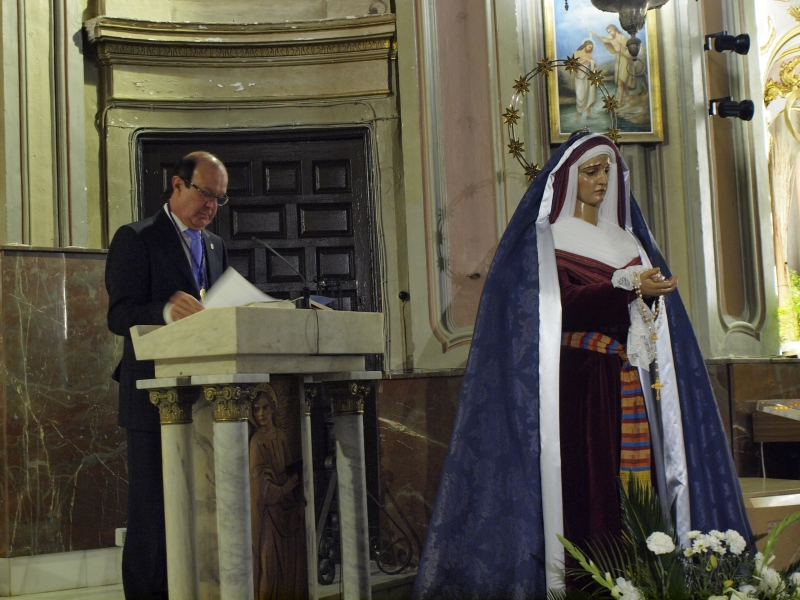 Continuaba sus palabras hacia los hermanos de Nuestra Señora de la Soledad del Puente y todos los presentes refiriéndose a la Sagrada Imagen que se veneraba en la ermita de San Roque, junto a las tallas de Jesús con la Caña. "Tras la guerra de la Independencia, en la que la ermita quedó destruida, las imágenes pasaron a la antigua parroquia de San Esteban, junto al convento de las Bernardas, y fue en febrero de 1818 cuando las imágenes procedentes de la ermita de San Roque, tras unos diez años en la antigua iglesia San Esteban, pasaron a engrosar las capillas y hornacinas de la iglesia de la Virgen de la Luz".
