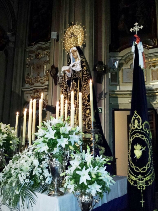 En esta ocasión, como novedad, pudimos contemplar a la Virgen de la Soledad en un elaborado Altar de Cultos que incluía gran profusión de flores y, sobre todo, una composición con velas de cera natural. Este altar fue preparado con gran ilusión y esfuerzo por los jóvenes de la Hermandad, que quisieron también sufragar el coste del mismo, de manera que este altar fuera una ofrenda de cariño y amor hacia la Virgen de la Soledad.